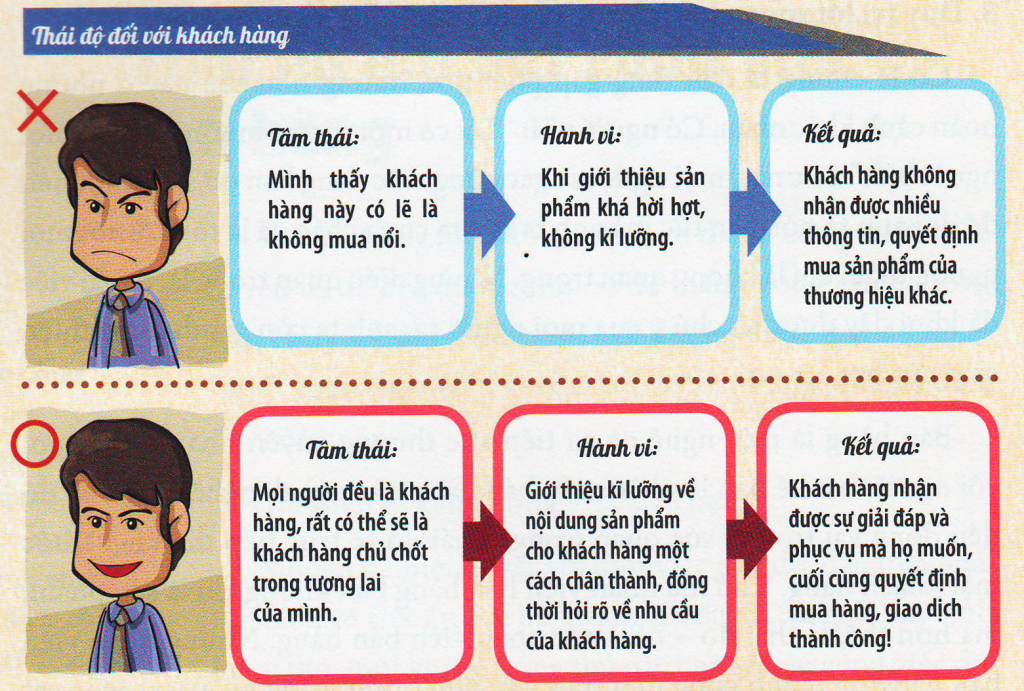 Bán hàng là một nghề có sự tiếp xúc thường xuyên nhất giữa người và người, bất kể bạn là nhân viên bán hàng của ngành nghề nào, thái độ đều đóng vai trò hết sức quan trọng. Thái độ sẽ trực tiếp thể hiện trước mặt khách hàng. Thứ mà nhân viên bán hàng bán không chỉ sản phẩm mà hơn thế, là thái độ – của một nhân viên bán hàng. Những nhân viên bán hàng đã thành công đều tràn đầy nhiệt tình, hằng ngày làm việc vất vả nhưng vẫn dồi dào sức sống, khách hàng thì như người bạn cũ với họ vậy. Được như vậy đều là nhờ năng lượng mà thái độ đem lại.