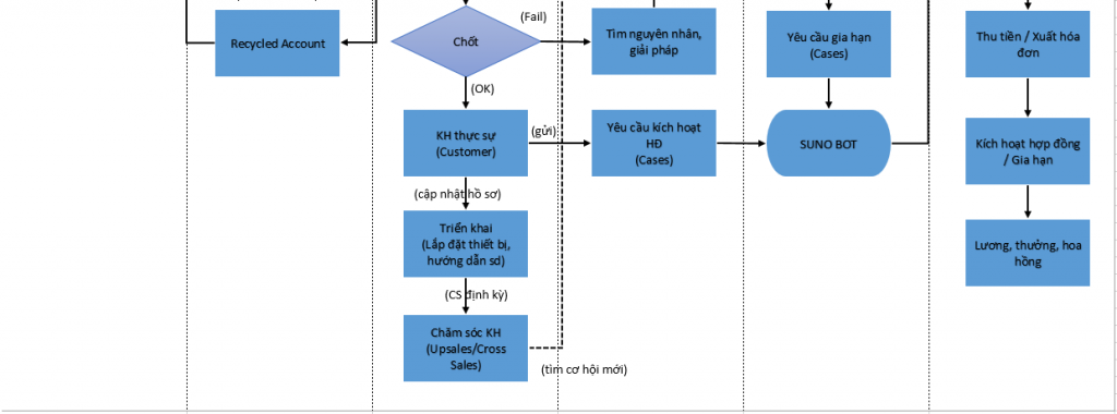 (6) CHỐT : Nếu quá trình bán hàng không thành công (Cơ hội bán hàng bị mất) thì tiến hành cập nhật lại thông tin Khách hàng Tiềm năng, ghi nhận các phản hồi từ khách hàng nếu có. Điểu chỉnh, lên kế hoach tiếp cận lại. Ngược lại, nếu bán hàng thành công, thì tiến hành các bước sau: