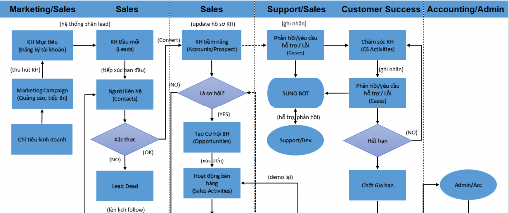 Các nhân viên sales sẽ tiến hành chăm sóc các Cơ hội bán hàng bằng các Hoạt động bán hàng (Sales Activities) ở bước 5.